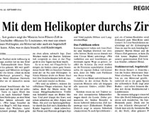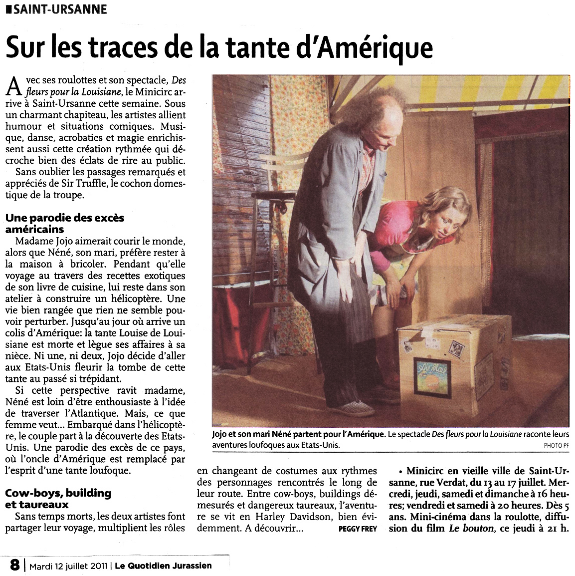 | Le Quotidien Jurassien, 12.07.2011: "Sur les traces de la tante de l'Amérique" | Anzeiger von Uster, 22.09.2011: "Mit dem Helikopter durchs Zirkuszelt" | Telebasel, 16.06.2011: "Was lauft" |