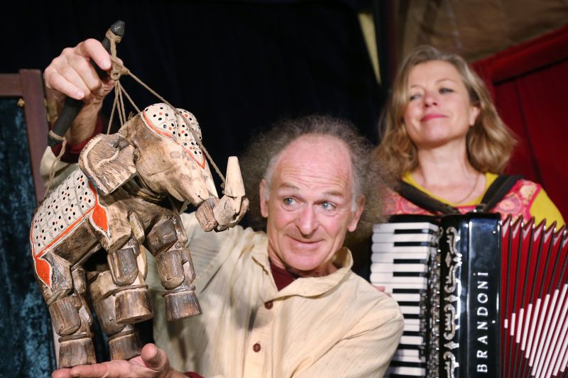 Qu’est-ce qui fait courir un jeune garçon et un éléphant d’horizon en horizon? Ce ne peut être que l’amour. Qu’est-ce qui les fait tenir dans les pires moments ? Une profonde amitié entre l’homme et l’animal. Et cette curiosité insatiable pour la vie derrière l’horizon. Par amour pour une jeune indienne un jeune homme anglais s’enfuit avec un éléphant en direction de l’occident. Les poches vides mais les journées pleines d’aventures. Une profonde amitié les emporte à travers la neige et le vent, les rochers et le sable, les oasis et les bazars, les villages et les villes jusqu’au jour où ils rencontrent un curieux cirque de poules. C’est là que se termine la vie de l’éléphant. Mais pas l’histoire. C’est une marionnette qui poursuit le récit. Et le voyage dure jusqu’à l’horizon. Voir calendrier |